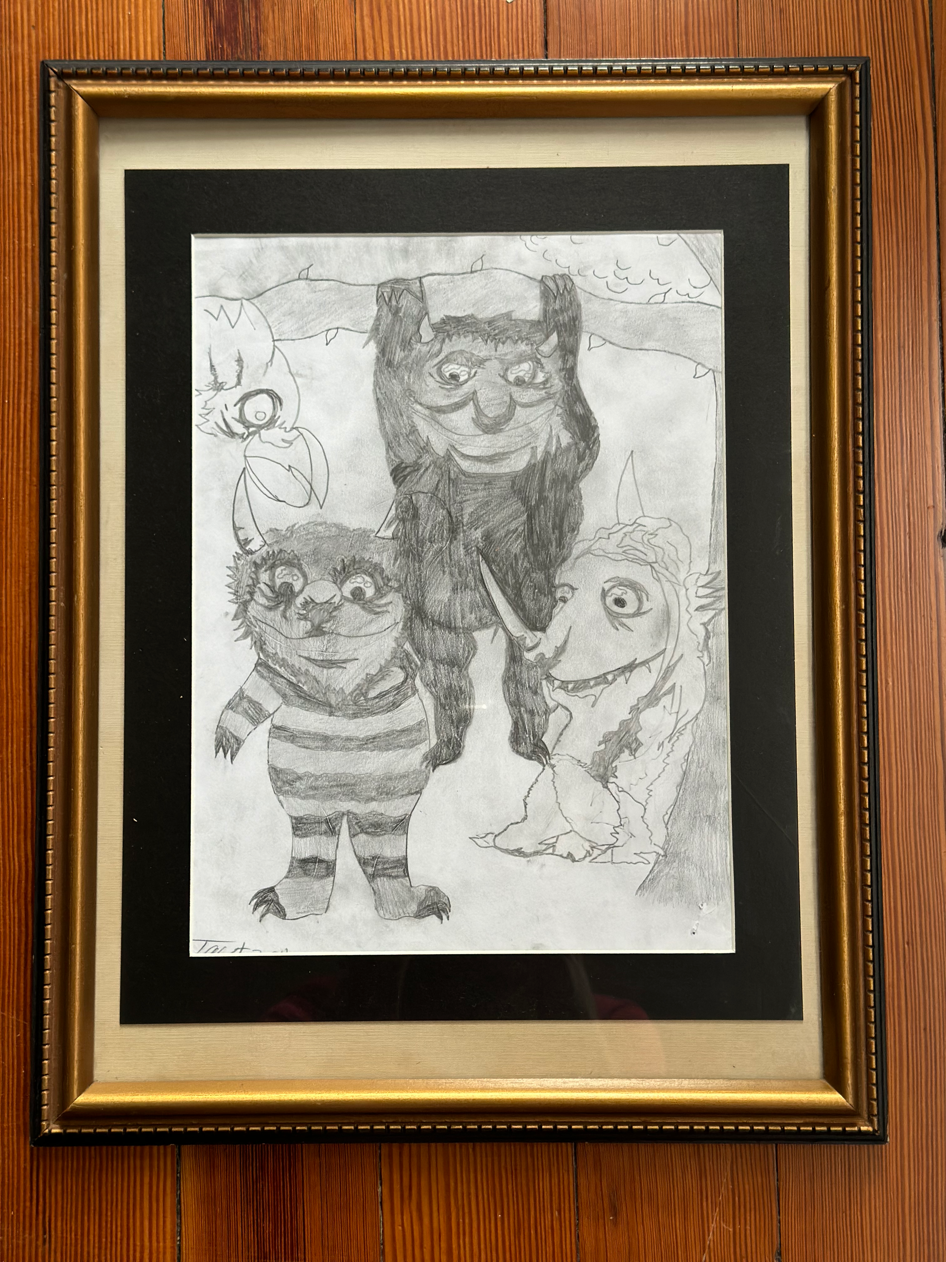 Where the Wild Things Play, original artwork by Tayt in a wooden custom glass frame with matting. The dimensions are approximately 13.5" x 18". This is a one of a kind painting.